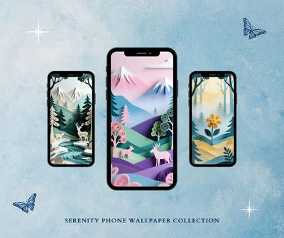 Phone screen displaying a nature-themed wallpaper with deer and mountains, surrounded by black butterflies on a light gray background.